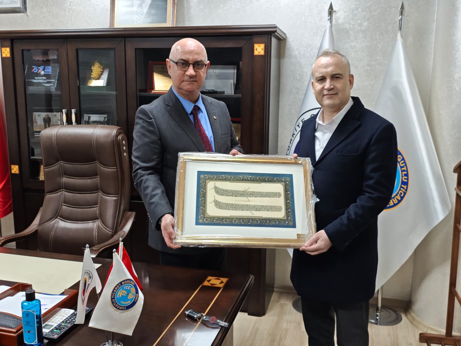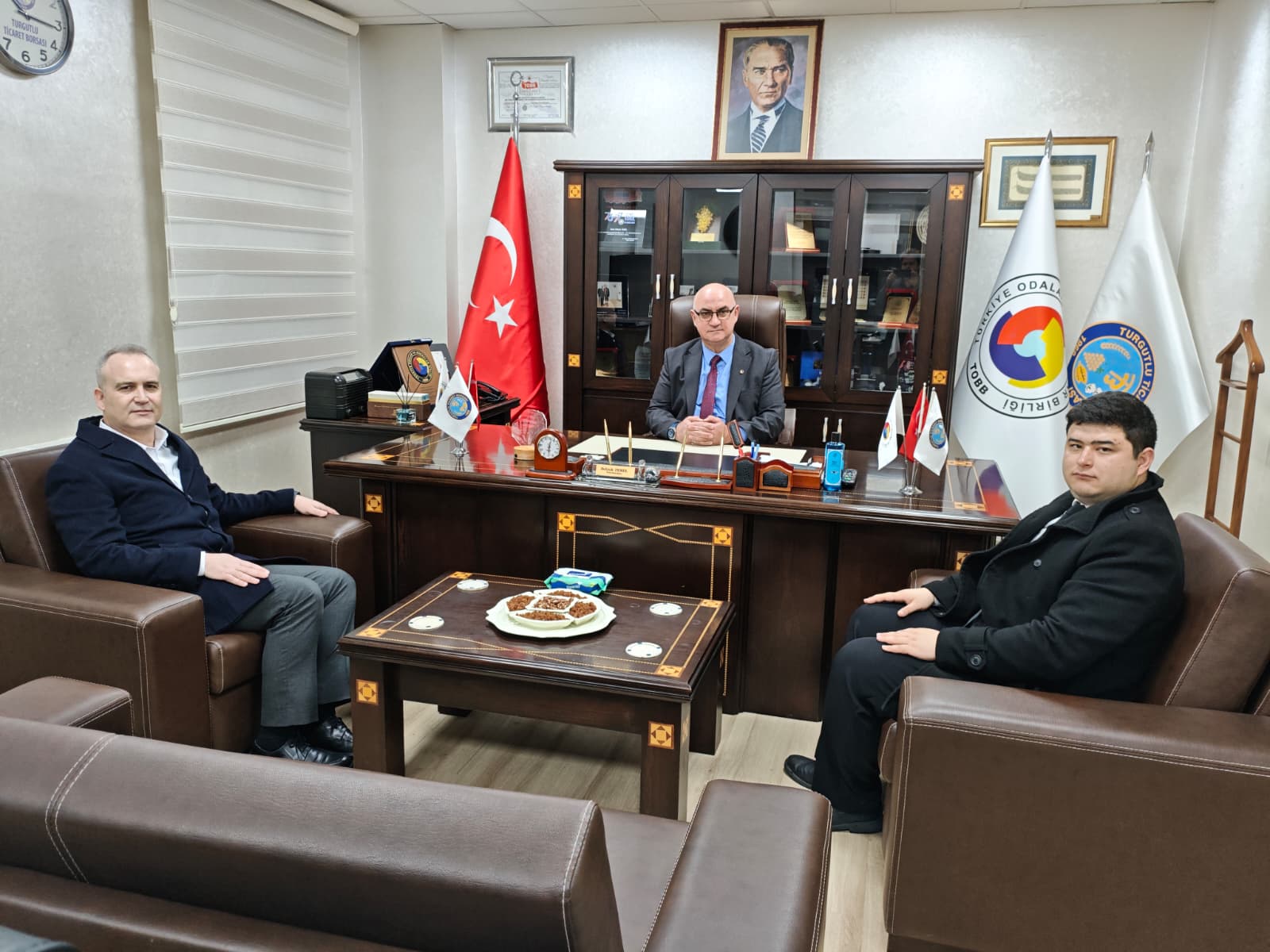 Albaraka Türk Katılım Bankası A.Ş. Turgutlu Şubesi Müdürü Aydın Canbaz ile Portföy Yöneticisi Mustafa Saka, Turgutlu Ticaret Borsası Yönetim Kurulu Başkanı Selçuk Temel’i makamında ziyaret etti.Gerçekleşen ziyarette, kurumlar arası iş birliği ve bölge ekonomisine yönelik değerlendirmelerde bulunulurken, karşılıklı görüş alışverişi yapıldı. Ziyaretin anısına, Albaraka Türk Katılım Bankası yetkilileri tarafından Başkan Selçuk Temel’e anlamlı bir hediye takdim edildi.Turgutlu Ticaret Borsası Yönetim Kurulu Başkanı Selçuk Temel, nazik ziyaretleri ve takdim edilen hediye dolayısıyla Albaraka Türk Katılım Bankası Turgutlu Şubesi yöneticilerine teşekkür ederek, çalışmalarında başarılar diledi.